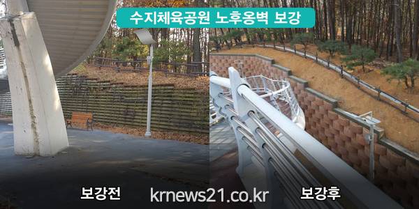 용인시는 수지구 풍덕천동 산13-2일대 수지체육공원 내 노후 옹벽을 안전하게 보강했다고 3일 밝혔다.