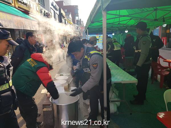 특히, 관내 문화의 거리에서 상가번영회와 협의하여 주민들을 위해 준비한 떡국 약 800인분을 무료 급식하여 새해에