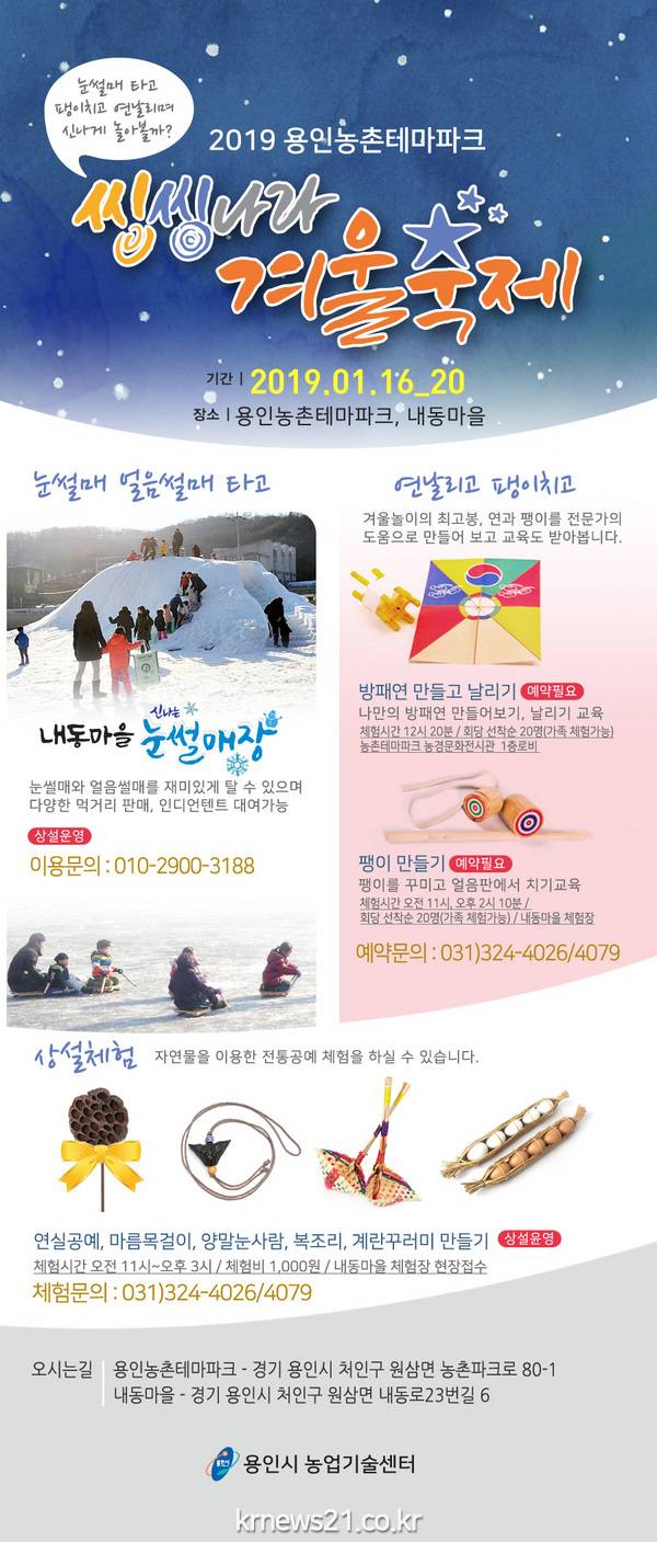 용인시는 겨울방학을 맞은 어린이들을 위해 오는 16일부터 20일까지 처인구 원삼면 사암리 농촌테마파크와 인근 내동마을에서 ‘씽씽 나라 겨울 축제’를 개최한다.