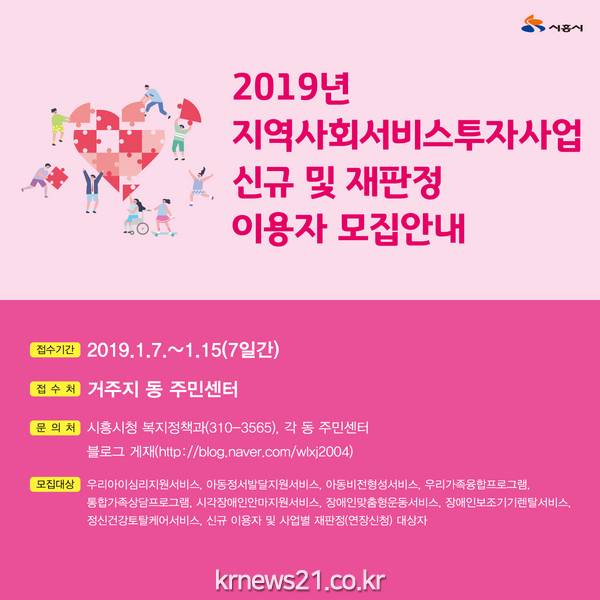 시흥시(시장 임병택)가 2019년도 지역사회서비스투자사업 바우처 이용자를 오는 15일까지 모집한다.