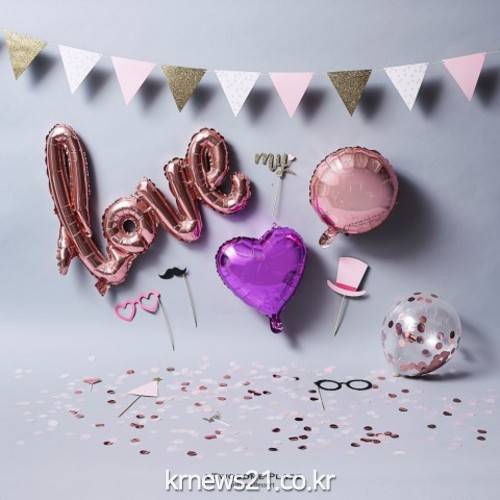 우선 파티 공간을 화려하게 꾸밀 수 있는 데코레이션 용품은 LOVE 글자 모양의 알파벳 풍선을 포함한 파티풍선 4종 외 가랜드, 색종이 조각 등으로 구성되어 있다. 각 용품들은 골드, 핑크, 화이트 색상으로 세련된 파티 분위기를 만들어 준다.