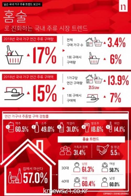 이번 보고서에 의하면 2018년 국내 가구 연간 주류 구매액은 한 가구당 8만4500원으로 전년 동기 대비 15% 증가했고 가구당 연간 구매량은 21.5리터로 13.9% 성장했다. 가구당 회당 구매액도 7% 상승한 것으로 나타났다. 연간 가구 내 주종별 구매 경험률은 맥주(60.5%)가 가장 높았고 소주(49%), 막걸리(31%), 발포주(18.6%), 와인(14.1%)이 그 뒤를 이었다. 닐슨은 이러한 가구 내 주류 구매 경험률 성장은 집 밖에서 마시던 주류 문화가 가족과 함께하는 ‘집 안’으로 옮겨지며 홈술 트렌드가 강화되는 것으로 보인다고 밝혔다.