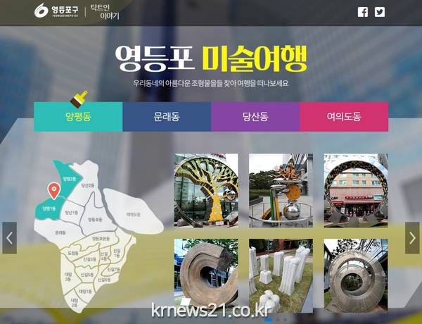 영등포구(구청장 채현일)가 지역 곳곳에 숨어있는 아름다운 예술작품을 한눈에 볼 수 있는 온라인 미술관 ‘영등포 미술여행’을 오픈했다.