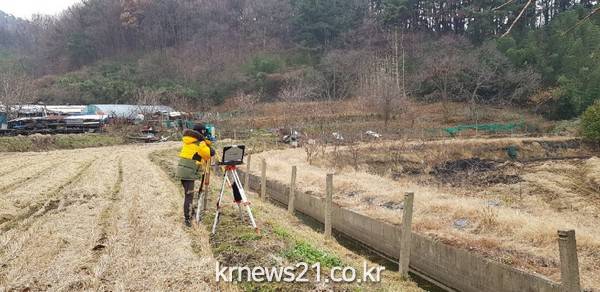 ▲ 지적측량 장면보령시는 올해부터 농업인과 국가유공자, 장애인을 대상으로 지적측량 수수료 30%를 감면한다.