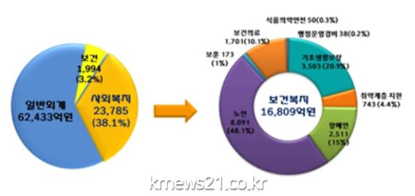 세부내역으로는 노인복지에 8,091억원으로 가장 큰 비율(48.1%)을 차지하고 다음이 기초생활보장 3,503억원, 장애인정책 2,511억원 순이다.