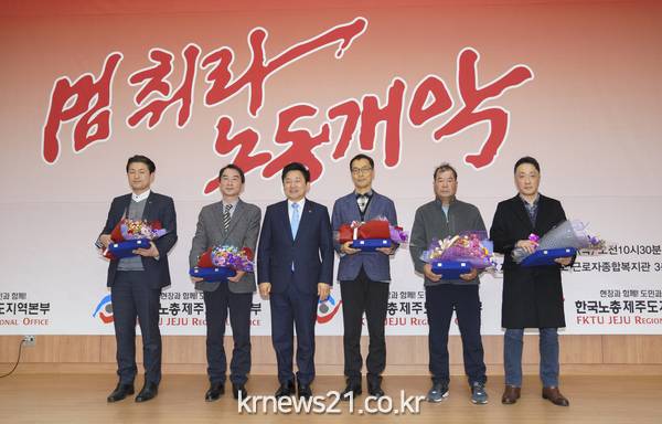 한편, 이날 대의원대회에는 원희룡 지사를 비롯해 이상철 한국노총 제주도지역본부 의장, 김대형 제주상공회의소 회장, 김주영 한국노동조합총연맹 위원장 등 대의원 및 조합원 100여명이 참석했다.