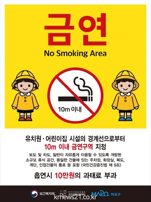 마포구(구청장 유동균)는 간접 흡연의 유해환경으로부터 어린이와 주민을 보호하기 위해 2019년부터 유치원·어린이집 경계 10m를 금연구역으로 지정하였다고 밝혔다.
