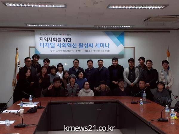 ▲ (사진=제주자치도청)제주특별자치도는 디지털사회혁신 활성화 세미나 및 공감e가득사업 완료보고회를 지난 23일 오후 벤처마루 9층 회의실에서 개최했다고 밝혔다.