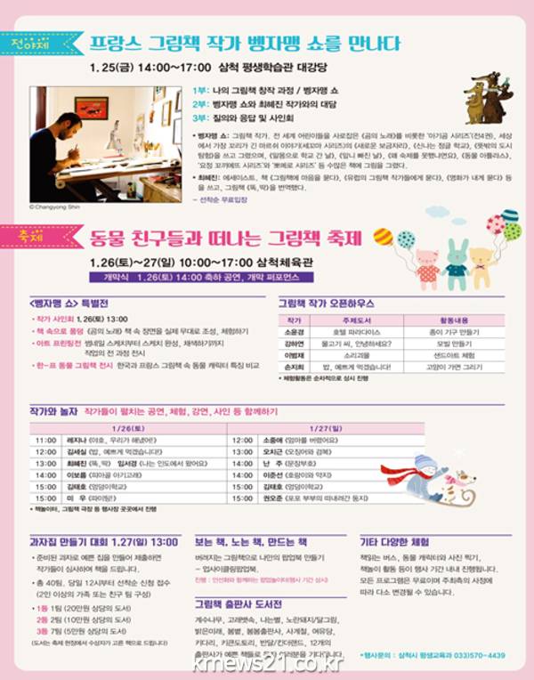 벵자맹 쇼와의 만남은 25일(금) 오후 2시 삼척평생학습관 대강당에서 진행되며, 그림책 창작 과정을 듣는 시간과 함께 질의와 응답 및 사인회 등으로 참석자들에게 즐거움을 선사할 예정이다.