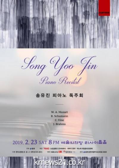 피스나스트 송유진의 피아노 독주회가 2월 23일(토) 오후 8시 예술의전당 리사이틀홀에서 진행된다. 이번 독주회는 W. Mozart, R. Schumann, C. Vine, J. Brahms의 작품들로 관중들을 찾아갈 예정이다.