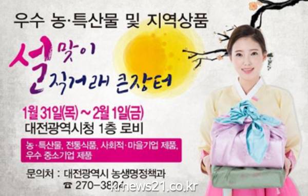 ▲ (사진=대전광역시청)대전시는 민족 최대 명절인 설을 맞아 오는 31일과 2월 1일 이틀 동안 시청 1층 로비에서‘설맞이 우수 농․특산물 및 지역상품 직거래 큰 장터’를 개장한다.