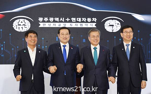 광주시와 현대자동차는 사회적 대타협을 기반으로 한 노·사 상생의 사회통합형 일자리인 광주형 일자리 첫 모델로 완성차 합작법인 설립사업 추진에 전격 합의하고, 31일 광주시청에서 투자협약을 체결했다.