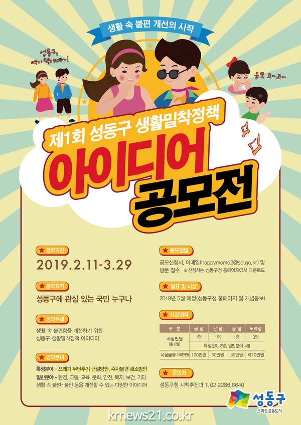 정원오 성동구청장은 “작은 아이디어로 일상생활을 편리하게 변화시키는 생활밀착정책에 대한 주민들의 호응이 매우 크다”며, “이번 공모전을 통해 주민들의 다양한 소리를 직접 듣고, 정책으로 실현하여 주민생활 편의도모는 물론 지역사회 문제를 주민과 더불어 해결하는데 만전을 기하겠다”고 밝혔다.