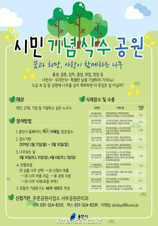나무 식재 위치와 수목 구입비용 등 자세한 문의는 용인시 서부공원관리과(031-324-8335)로 하면 된다.