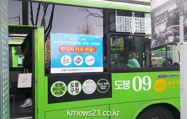 이를 위해 구는 관내 마을버스 업체와 연계해 도봉08번(5대), 도봉09번(14대) 모두 19대의 마을버스 외부에 자원 절약, 재사용, 재활용 실천을 위한 홍보 시트지를 제작해 부착하고 2월 7일부터 도봉구 곳곳을 운행중이다.