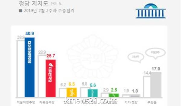 정의당은 0.3%포인트 상승한 6.5%, 바른미래당은 1.2%포인트 내린 5.6%로 집계됐다.