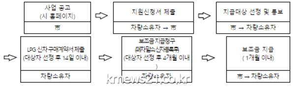 지원절차는 대상차량 소유자가 자동차등록증사본 등 구비서류를 첨부해 대전시에 신청서를 제출하면, 시에서 지원대상자를 선정하고, 14일 이내 신차구입 계약서를, 4개월 이내에 신차등록 후 보조금을 청구하면 된다.