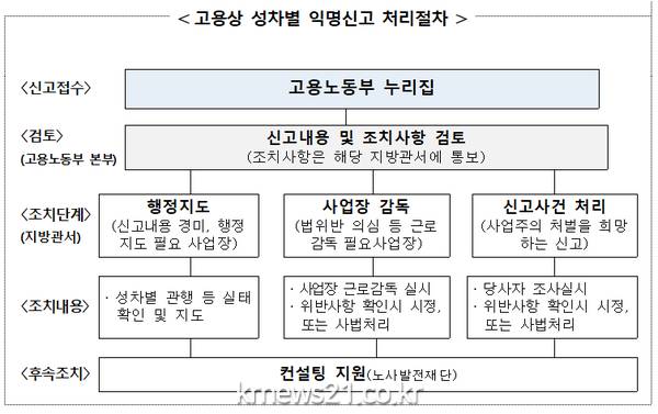 나영돈 고용정책실장은 “고용노동부는 익명신고만으로도 행정지도 및 사업장 근로감독에 착수하고 있으며, 피신고 사업장에 대해서는 법 위반 여부와 상관없이 고용평등 취약사업장으로 분류하여 집중 근로감독을 실시하는 등 지속해서 관리할 예정이다”며 “신고된 성차별 사례들 대부분이 2018년에 있었던 것으로 여전히 고용에서의 성차별이 빈번함을 알 수 있었다”고 말했다.