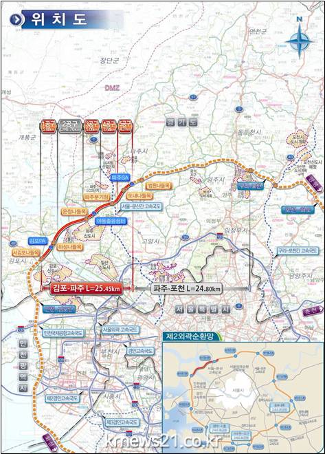 김포-파주 고속도로는 「김포시 양촌읍 흥신리」부터 「파주시 파주읍 부곡리」까지 총 25.45km 구간에 4차로로 건설되며 다가오는 2025년 준공될 계획이다.