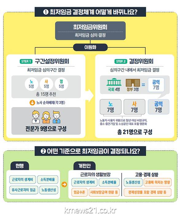 최저임금 결정체계는 구간설정위원회와 결정위원회로 이원화하는데, 구간설정위 전문가위원은 노·사·정 추천 등에 따라 9명이며 결정위는 노·사·공익 위원 각 7명이다.