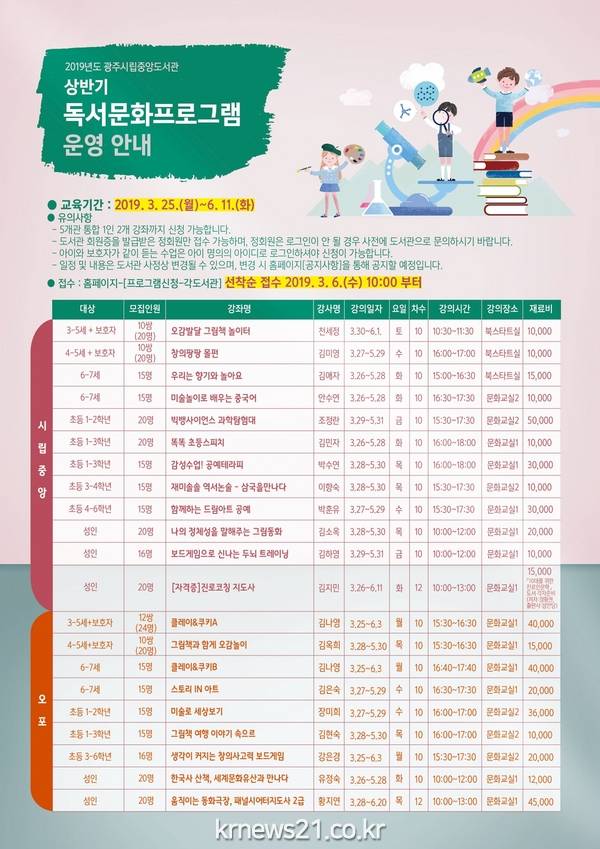광주시립 중앙도서관(관장 이용태)은 오는 6일부터 ‘2019년 상반기 독서문화 프로그램’ 수강생을 모집한다.