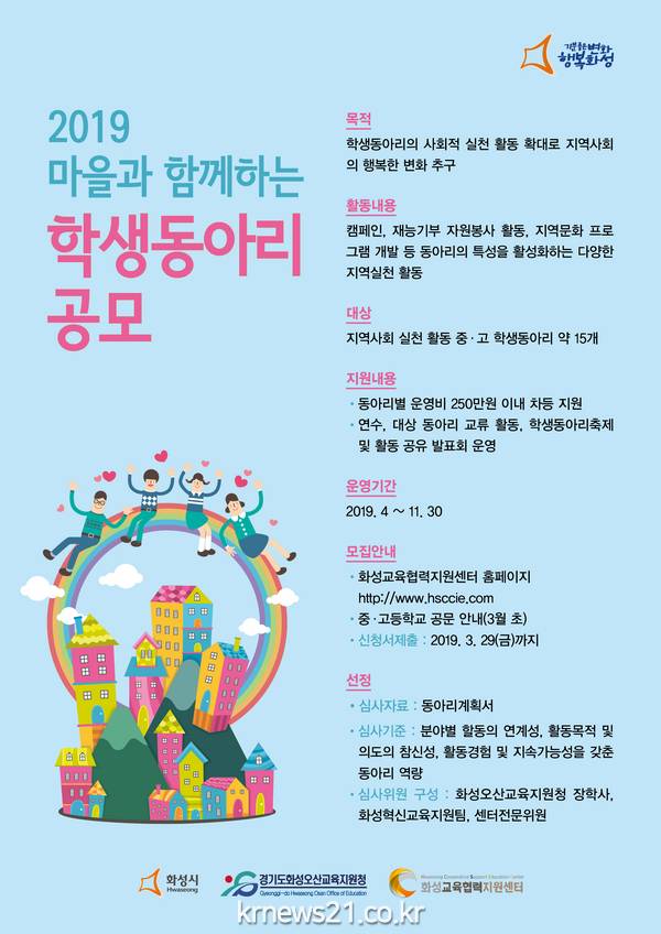 (재)화성시 인재육성재단 화성 교육협력지원센터에서는 지역사회와 함께하는 15개의 학생동아리를 선발한다.