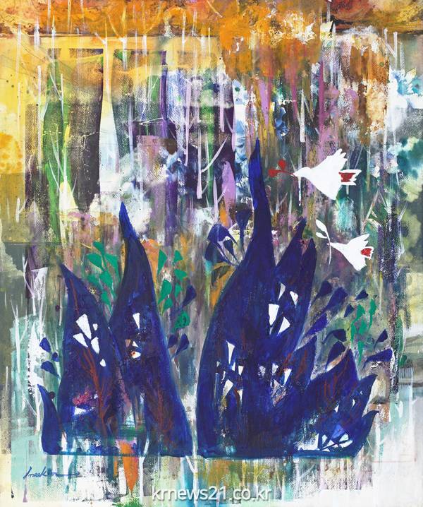 작품에서 반복은 시간의 축적을 의미한다. 불규칙한 형상들이 화면의 기조로 남아 있지만 전면에 드러나지 않고 수많은 붓질이 이를 덮는다. 자연현상을 아름다운 색채로 표현하여 꿈꾸는 이상향을 전달하고, 화면의 수많은 붓질로 본인의 모든 상념과 희로애락을 잠재운다. 그리고 그 위에 모든 자연 현상계 아름다움이 실안에서 심안으로 연결되며 바이브레이션으로 어우러진다,