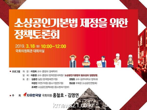 국회 자유한국당 홍철호 의원(경기 김포시을, 국토교통위원회)은 오는 18일 오전 10시 국회의원회관 대회의실에서 김명연 의원(자유한국당)과 「소상공인기본법 제정을 위한 정책토론회」를 공동 개최한다고 밝혔다.