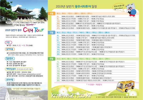 한편, 시티투어 일정은 광주시청 홈페이지에서 확인 가능하며 운영업체인 ㈜로망스투어(02-318-1664)로 예약 가능하다.