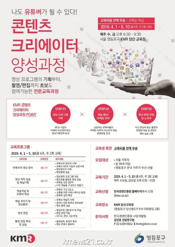 영등포구(구청장 채현일)가 4월 1일부터 5월 10일까지 청년들 대상으로 ‘1인 미디어 크리에이터 양성 교육’을 운영한다.