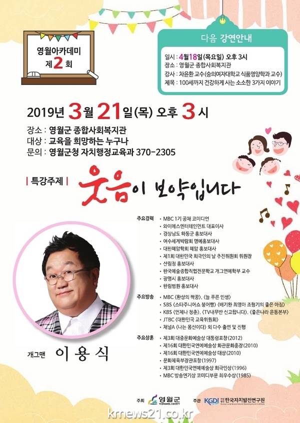 영월군은 21일 오후 3시 영월군 종합사회복지관에서 개그맨 겸 방송인 이용식 씨를 초청해 “웃음이 보약입니다” 라는 주제로 영월아카데미를 연다.