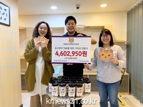 (주)캣페스타(대표 조수미, 서정애)와 (유)마도로스펫(대표 김건일)이 21일 (사)한국고양이보호협회에 기부금 460만2950원을 기증했다.
