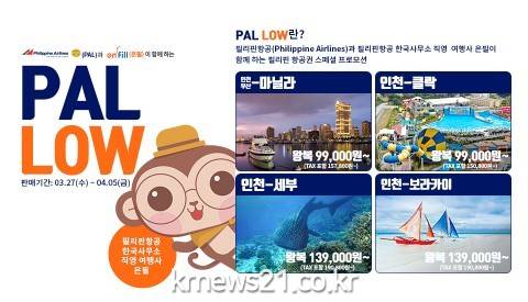 PAL LOW는 3월 27일부터 4월 5일까지 진행될 예정이며, 필리핀항공 한국사무소 직영 여행사 온필을 통해 예매 가능하다.