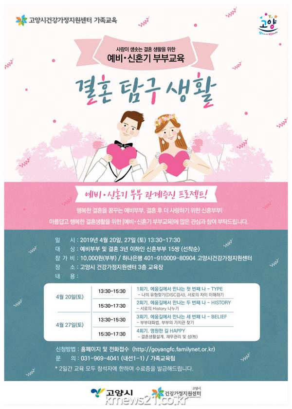 고양시는 건강가정지원센터 주관으로 행복한 결혼생활을 꿈꾸는 예비․신혼부부를 대상으로 ‘결혼탐구생활 부부교육’을 진행한다.