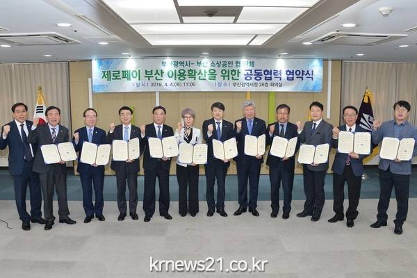 부산시(시장 오거돈)는 4월 4일 오전 11시 시청 26층 회의실에서 지역의 소상공인 협외 및 단체와 제로페이 이용확산을 위한 「제로페이 활성화 업무협약」을 체결했다고 밝혔다.