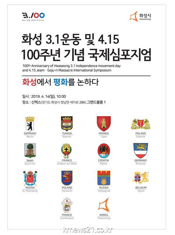 한편, 이번 국제심포지엄과 이튿날 열리는 ‘4.15 100주년 화성 제암·고주리 학살사건 희생자 추모제’에는 세계평화연대 도시 프랑스 됭케르크, 튀니지 비제르테, 독일 로스토크, 러시아 상트페테르부르크 대표단이 참석할 예정이다.