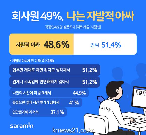 구인구직 매칭 플랫폼 사람인(www.saramin.co.kr 대표 김용환)이 직장인 422명을 대상으로 ‘회사에서 ‘인싸’와 ‘아싸’ 중 어디에 해당되는 지에 대해 조사한 결과, 10명 중 5명은 ‘자발적 아웃사이더’라고 답했다.