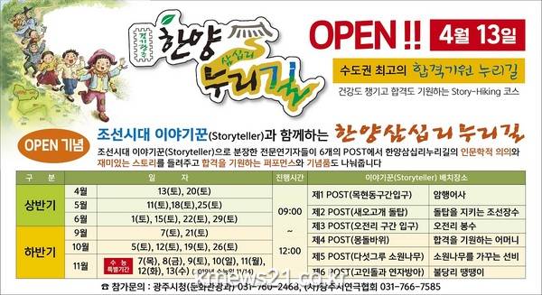 광주시(시장 신동헌)는 오는 13일 ‘조선 시대 이야기꾼과 함께하는 한양 삼십리 누리길’을 오픈한다고 11일 밝혔다.