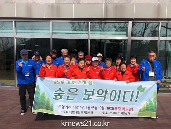 ▲ (사진=양평군청 제공)양평군은 과다이용 의료수급자를 대상으로 산림 속 숲체험을 통하여 몸과 마음을 치유하는 2019년『숲은 보약이다』프로그램을 4월 4일부터 5월 23일까지 총 8회에 걸쳐 양평 쉬자파크 치유센터에서 진행하고 있다.