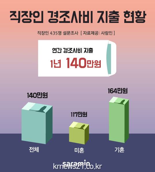 직장인들은 월평균 1.6회 경조사에 참석하고 1회당 평균 7만 3천원을 지출하는 것으로 집계되었다. 1년이면 140만원 정도를 지출하는 셈이다.