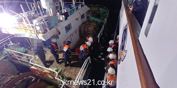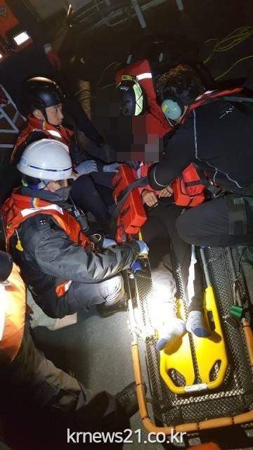 - - 해상에서 헬기에 직접 응급환자 옮겨 신속히 육지 병원 이송, 생명엔 지장 없어 -