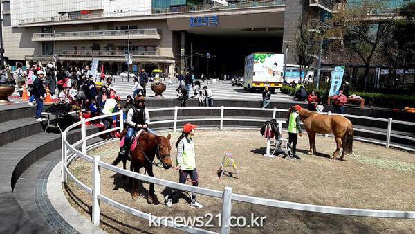 ▲ (사진=왕십리광장에서 무료 승마체험)성동구(구청장 정원오)는 한국마사회와 협력으로 관내 왕십리광장에서 지난 6일부터 4월 한 달간 매주 토요일, 일요일에 ‘도심승마체험행사’를 실시한다.(단, 4월 20일(토) 제외)