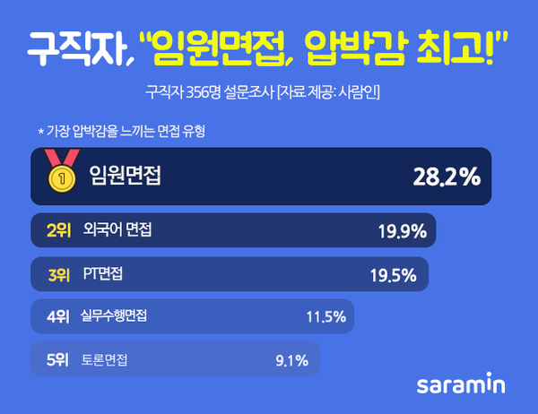 최근 실무역량 평가를 위해 다양한 형태의 면접이 시행되고 있는 가운데, 가장 압박감을 많이 느끼는 유형으로는 면접의 최종단계인 ‘임원면접’(28.2%)이 1위로 꼽혔다. 아무래도 면접관의 직책도 높고, 채용전형의 가장 마지막으로 여겨지기 때문인 것으로 보인다. 이어 ‘외국어 면접’(19.9%), ‘PT면접’(19.5%), ‘실무수행면접’(11.5%), ‘토론면접’(9.1%), ‘구조화면접’(4.5%), ‘이색면접(상황극, 술자리, 등산)’(4.5%) 등이 있었다.