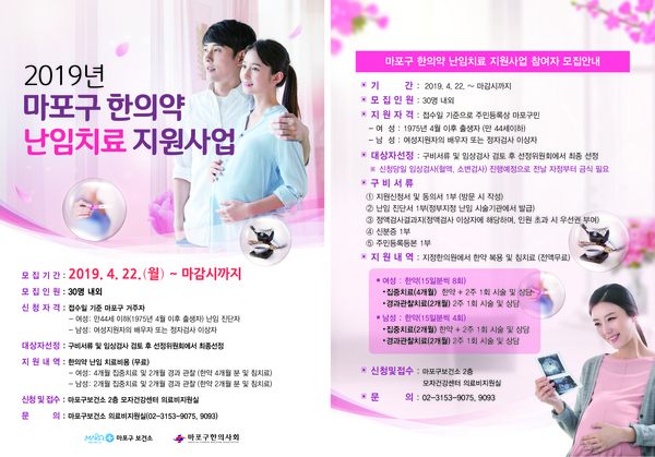 유동균 마포구청장은 “이번 공모사업 선정으로 난임부부들의 경제적 부담을 덜어줄 수 있게 됐다”며 “한의약 난임치료 등 다양한 치료 방법을 통해 출산율이 향상될 수 있도록 노력하겠다“고 밝혔다.