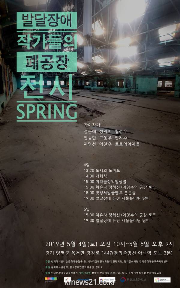▲ [사진=홍보포스터]함께해서 신나는 문화예술협동조합 틈(이하 협동조합 틈)과 전국장애인부모연대 양평지회 (이하부모연대 양평지회)는 오는 5월 4일부터 5월 5일까지 발달장애인 작가들이 참여하는 “양평 폐공장 전시회 SPRING” 전을 개최한다.