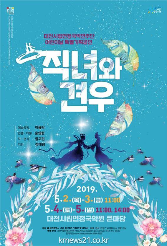 대전시립연정국악원 국악연주단은 어린이들과 가족들을 위해 내달 2일부터 5일까지 오전 11시, 오후 2시에 국악원 큰마당에서 어린이날 공연‘직녀와 견우’공연을 개최한다.