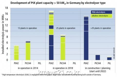 분석에 따르면 PtX 프로젝트 수는 뚜렷하게 증가했으며 2022년까지 독일에서만 35개의 발전소가 가동될 것으로 예상된다. 현재 PtX 발전소의 총 설치 전력은 26MW이며 2014년 이후 두 배 이상 증가했다. 대부분 프로젝트에서 이른바 고분자전해질(PEM: Polymer Electrolyte Membrane)을 사용하는데, 기존의 알칼라인 전기분해 기술에 비해 부하변동에 대한 유연성이 좋다. Power-to-Liquid(PtL) 공정에 적합한 고온 전기분해 기술을 사용하는 프로젝트는 주로 독일 외 국가에 계획되어 있다. 독일 프로젝트에서 주목할 만한 점은 생산한 수소를 추가로 다른 에너지 운반체로 처리하지 않고 이용하는 방식에 더욱 중점을 두고 있다는 것이다. 이에 따라 정제소의 공급 원료 또는 차량 연료로서 친환경 수소 사용이 늘고 있다.