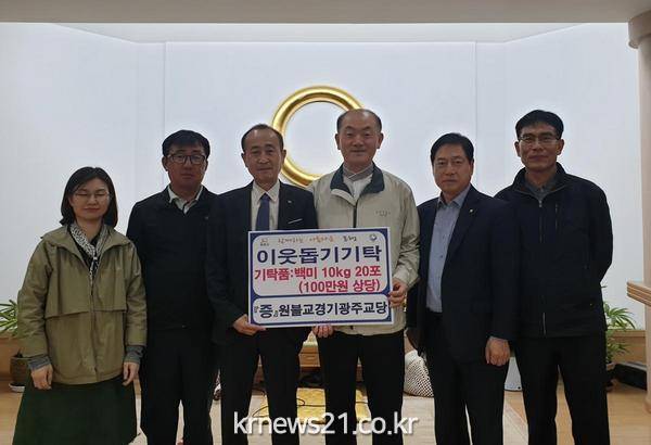 원불교 경기광주교당은 이달 초 원불교 열린 날인 대각개교절을 기념해 관내 저소득 홀몸어르신들에게 김치 45상자를 전달했으며 매년 지역의 어려운 이웃을 위해 사랑의 쌀 나눔 행사를 펼치고 있다.