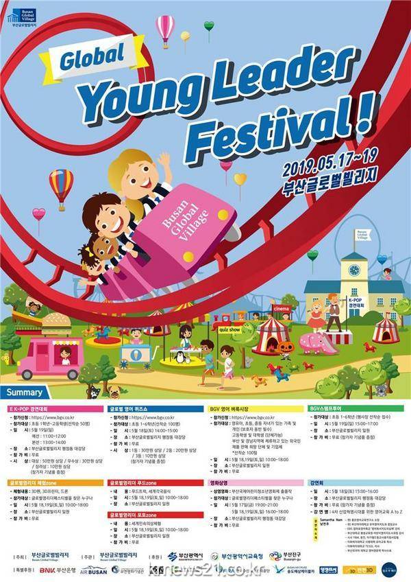 ▲ [사진=부산글로벌빌리지 영어마을 홍보포스터] 부산시(시장 오거돈)와 부산시교육청은 부산글로벌빌리지 영어마을에서 오는 5월 17일부터 19일까지 3일간 ‘글로벌 영리더 페스티벌'을 개최한다고 밝혔다.