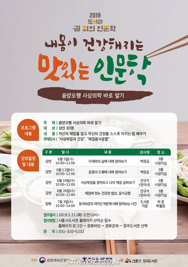 2019년 도서관 길 위의 인문학 사업에 선정된 장곡도서관의 ‘내 몸이 건강해지는 맛있는 인문학’ 프로그램이 참가자를 모집한다. 도서관 ‘길 위의 인문학’은 지역주민들이 이용하는 가까운 도서관을 통해 현장과 생활 속에서 함께하는 인문학 구현을 지원하기 위해 문화체육관광부가 주최하고 한국도서관협회가 주관하는 사업이다.
